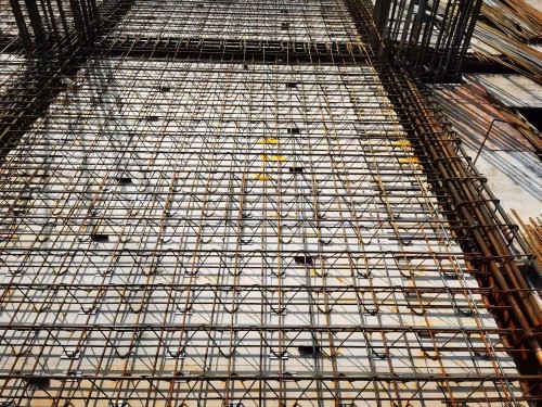 5.焊接栓釘,現(xiàn)場鋼筋綁扎,其中包括與橫架垂直方向的分布鋼筋、樓承板斷開處的連接鋼筋、柱邊加強鋼筋、洞口邊加強鋼筋。