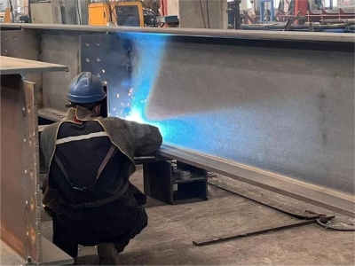 鋼結構剛度不足時,在設計焊接連接縫位置及數(shù)目時,應以對稱方式布置,且焊接順序合理,構件只能產生線性變形,若焊縫呈非對稱布置,則多產生彎曲變形。焊法:厚鋼板焊接時,焊接電流過大,焊條直徑過大,導致焊接速度慢,造成焊接變形大;厚鋼板焊接時,手工焊產生的變形比自動焊產生的變形??;采用多層焊接時,首層焊縫收縮變形較大,二層和三層焊縫變形分別為一層的20%,二層的5%~10%。