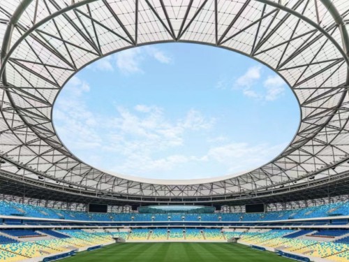 成都鳳凰山足球場,建筑面積約13萬平米,是一座滿足FIFA標準、有6萬個座位的足球場,是2023年亞洲杯成都賽區(qū)主場館。該工程結(jié)構(gòu)平面為類圓,南北向長軸直徑279m,東西向短軸直徑234m,結(jié)構(gòu)關(guān)于長軸對稱,北高南低。罩棚體系是由索桿系、外壓環(huán)梁、剛性內(nèi)拉環(huán)析架組成的國際首例環(huán)形剛性內(nèi)拉環(huán)索穹頂結(jié)構(gòu)。索穹頂區(qū)域屋面采用單層索網(wǎng)支承的ETFE膜結(jié)構(gòu),透光性良好,總面積25000平米,透光率高達40%,拉索與屋面膜結(jié)構(gòu)相得益彰,充分體現(xiàn)了結(jié)構(gòu)之美與建筑之美。