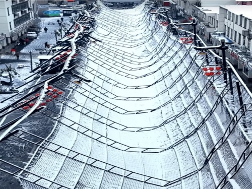 河南一新建的小吃街鋼結(jié)構(gòu)天幕在大雪中被壓垮,