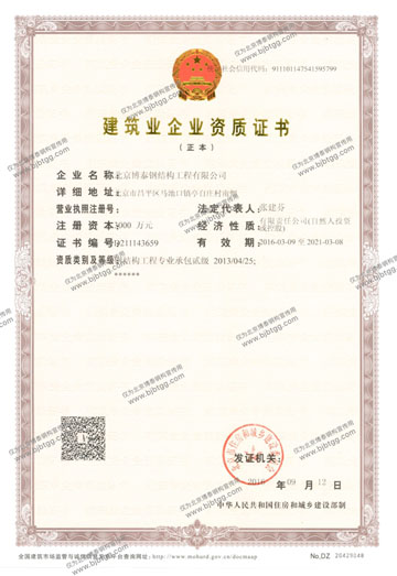 一:資質(zhì)完備 資質(zhì)要求在建筑行業(yè)尤為重要,如果沒有資質(zhì)證書,則說明這家公司沒有足夠的能力去完成這項(xiàng)工程。換句話說,公司資質(zhì)是一家建筑工程公司實(shí)力的證明。北京博泰鋼構(gòu)是一家