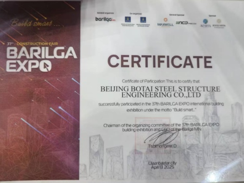 北京博泰鋼結(jié)構(gòu)工程有限公司將繼續(xù)尋求突破、拓展市場,為我國乃至多國的建筑行業(yè)發(fā)展添磚加瓦,共同建設(shè)更加輝煌燦爛的明天!2025年4月11-13日,北京博泰鋼結(jié)構(gòu)公司總經(jīng)理范清河與技術(shù)部銷售部人員參加了2025蒙古國建材展。此次參展,公司榮獲”優(yōu)異企業(yè)“的稱號。