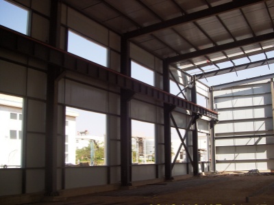 在鋼架搭起來之前要做的是埋鐵件,準(zhǔn)備好水平儀、電錘和電焊機(jī)等,在地下埋好鋼板之后,用電焊機(jī)和水準(zhǔn)儀確保鋼柱的水平,然后將